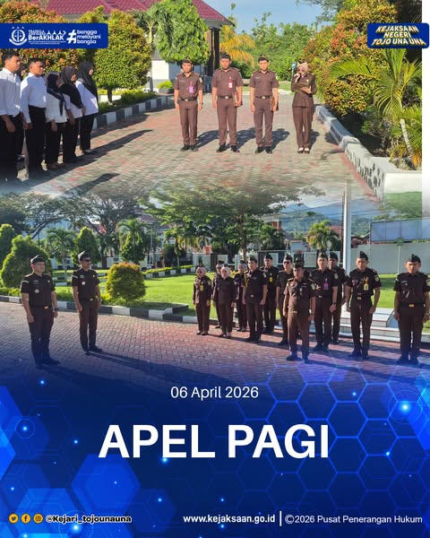 Pada hari Senin tanggal 06 April 2026, Sekira pukul 07.30 WITA bertempat di Kejaksaan Negeri Tojo Una Una, telah dilaksanakan Apel Pagi, Kepala Seksi Pidana Umum Kejaksaan Negeri Tojo Una Una Bapak ADE CANDRA KIRANA DAMANIK, S.H.,M.H. bertindak sebagai penerima apel dan diikuti oleh para Kasi/Kasubag dan seluruh pegawai Kejaksaan Negeri Tojo Una Una.