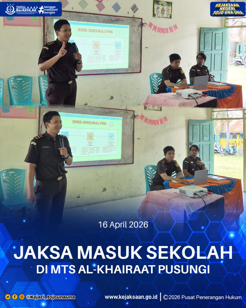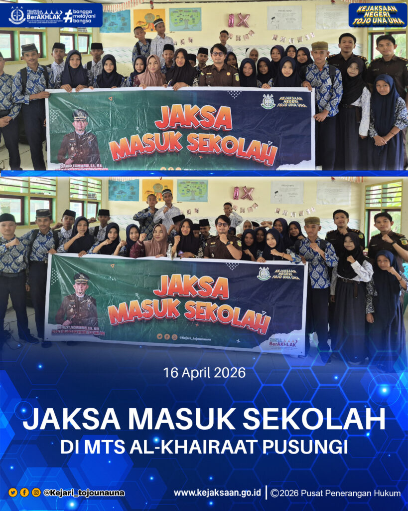 Pada hari Kamis tanggal 16 April 2026, Kejaksaan Negeri Tojo Una Una melakukan kegiatan Jaksa Masuk Sekolah bertempat di MTS AL-KHAIRAAT PUSUNGI.