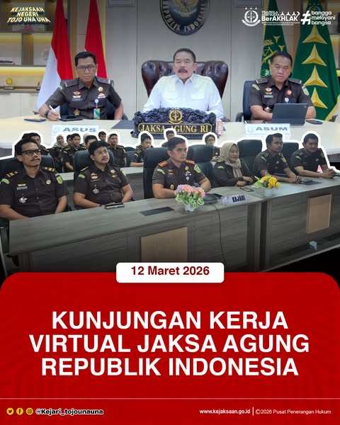 Pada hari Kamis tanggal 12 Maret 2026, bertempat di Aula Kantor Kejaksaan Negeri Tojo Una Una, Kepala Kejaksaan Negeri Tojo Una Una Bapak Dr. RIZKY FAHRURROZI, S.H., M.H., beserta seluruh Jajaran Kejaksaan Negeri Tojo Una Una mengikuti Kunjungan Kerja Virtual Jaksa Agung Republik Indonesia yang dilaksanakan secara daring melalui zoom meeting.