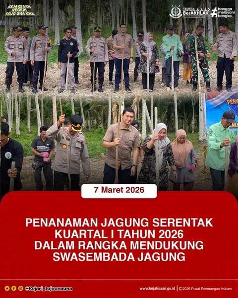 Pada hari Sabtu tanggal 07 Maret 2026 pukul 15.30 WITA, bertempat di Desa Patingko, Kecamatan Ratolindo, Kabupaten Tojo Una Una, telah dilaksanakan kegiatan Penanaman Jagung Serenrak Kuartal I Tahun 2026 Dalam Rangka Mendukung Swasembada Jagung. Kegiatan tersebut dihadiri oleh Kepala Kejaksaan Negeri Tojo Una Una Dr. RIZKY FACHRUROZI, S.H., M.H. yang diwakili oleh Kepala Seksi Intelijen Kejaksaan Negeri Tojo Una Una PANGERANG SB, S.H., M.H., bersama unsur Forum Koordinasi Pimpinan Daerah (Forkopimda) serta para tamu undangan lainnya.