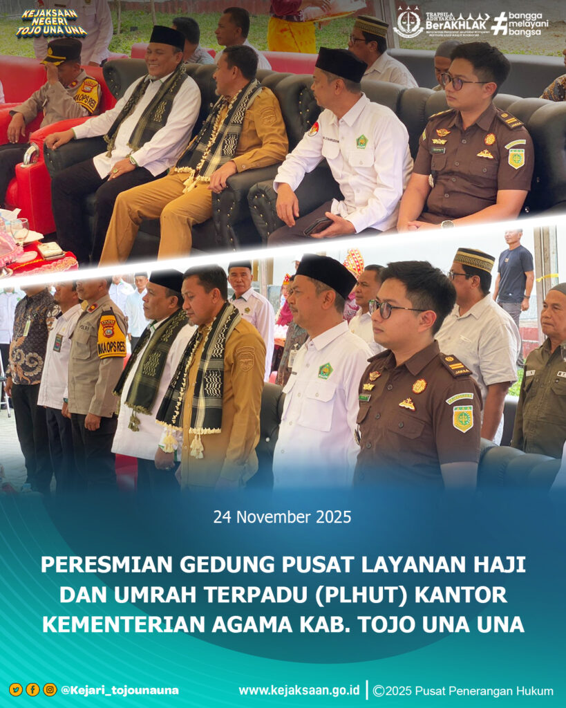 Pada hari Senin tanggal 24 November 2025 pukul 10.30 WITA bertempat di Gedung PLHUT Kementerian Agama Kab. Tojo Una Una, Kepala Kejaksaan Negeri Tojo Una Una Bapak Dr. RIZKY FAHRURROZI, S.H., M.H. diwakili oleh Kepala Sub Seksi Intelijen Bapak ASSTAPURI, S.H. menghadiri Peresmian Gedung Pusat Layanan Haji dan Umrah Terpadu (PLHUT) Kantor Kementerian Agama Kab. Tojo Una Una. Kegiatan ini dihadiri oleh Unsur Forkopimda, Undangan Calon Jama’ah Haji, dan Staf Kementerian Agama Kab. Tojo Una Una.