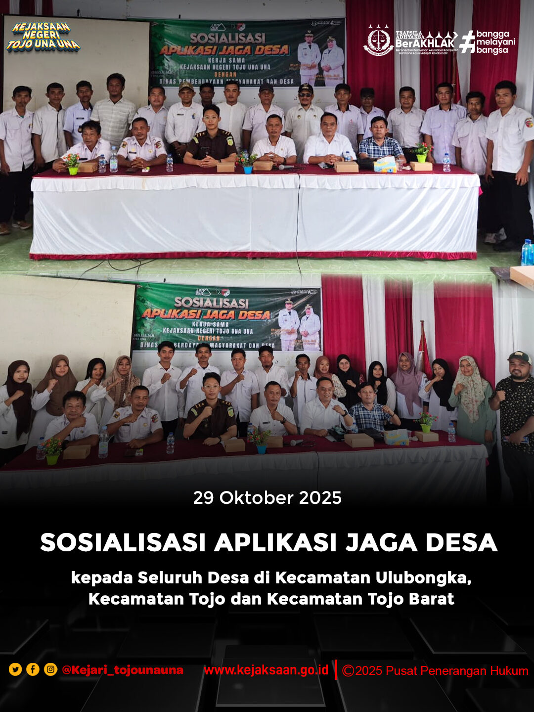 Pada hari Rabu tanggal 29 Oktober 2025 pukul 09.00 WITA bertempat di Aula Kantor Camat Ulubongka, Kepala Kejaksaan Negeri Tojo Una Una Bapak Dr. RIZKY FAHRURROZI, S.H., M.H. dalam hal ini diwakili oleh Calon Jaksa Bapak BENNY DWI HERMAWAN, S.H. menghadiri kegiatan Sosialisasi Aplikasi Jaga Desa kepada Seluruh Desa di Kecamatan Ulubongka, Kecamatan Tojo dan Kecamatan Tojo Barat.